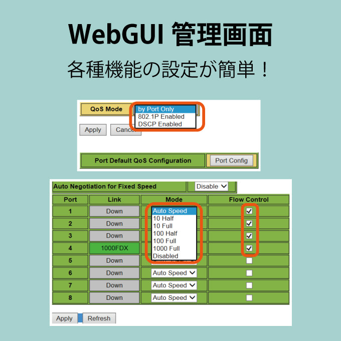 IEEE802.1QタグVLAN、ポートランク、ポートミラーリング、省エネ等、従来の機能に加えループ監視/遮断機能を搭載しWebブラウザから簡単に設定が可能です。